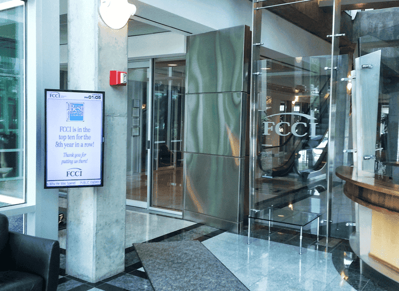 MediaVision於2013年開始規劃FCCI Insurance Group的數位看板解決方案;過去兩年間,FCCI的管理團隊明顯感受到,公司與員工、訪客間的溝通越加順暢,而廠商的優異服務,穩定的產品,和使用容易上手的中央管理軟體更是錦上添花。因此,在將網絡延伸到全國的辦公室後,近期FCCI正考量加入互動式的樓層導覽,輕鬆整合觸碰螢幕與SMP播放器,為辦公室空間增添更多活力。
