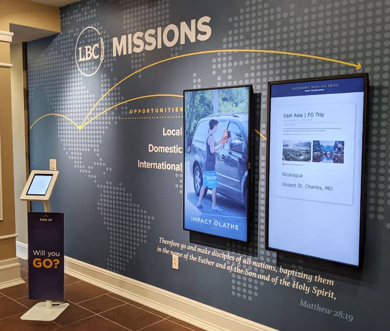 鎧應科技數位看板在教堂品牌方面發揮了至關重要的作用,儘管理念各有不同,但每個校園的數位看板均傳達了各教會清晰的理念與價值觀,不謹統一了教會形象,也加強了校園之間的聯繫。Lenexa浸信會還利用鎧應科技SMP-2300,提供即時和媒體訊息,通過互動式宣教牆(帶紅外線的50英寸電視)提高教區居民的參與度和出席率。教會成員可以獲得有關當前宣教旅行機會的詳細資訊,與宣教的照片和影片進行互動。